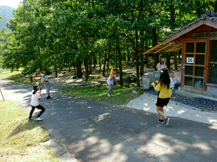午後の自由時間、川遊びに行かなかった子どもたちは、塾の講師たちと水鉄砲大会です。